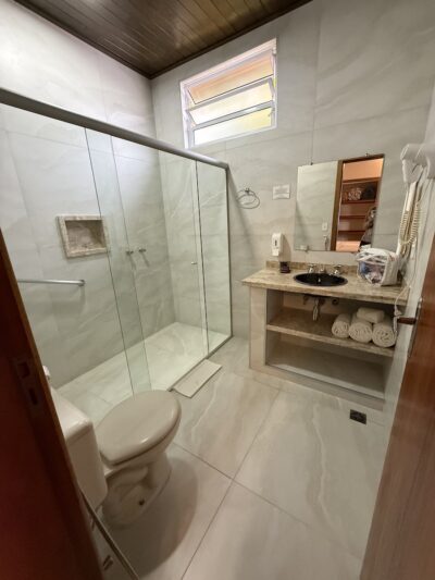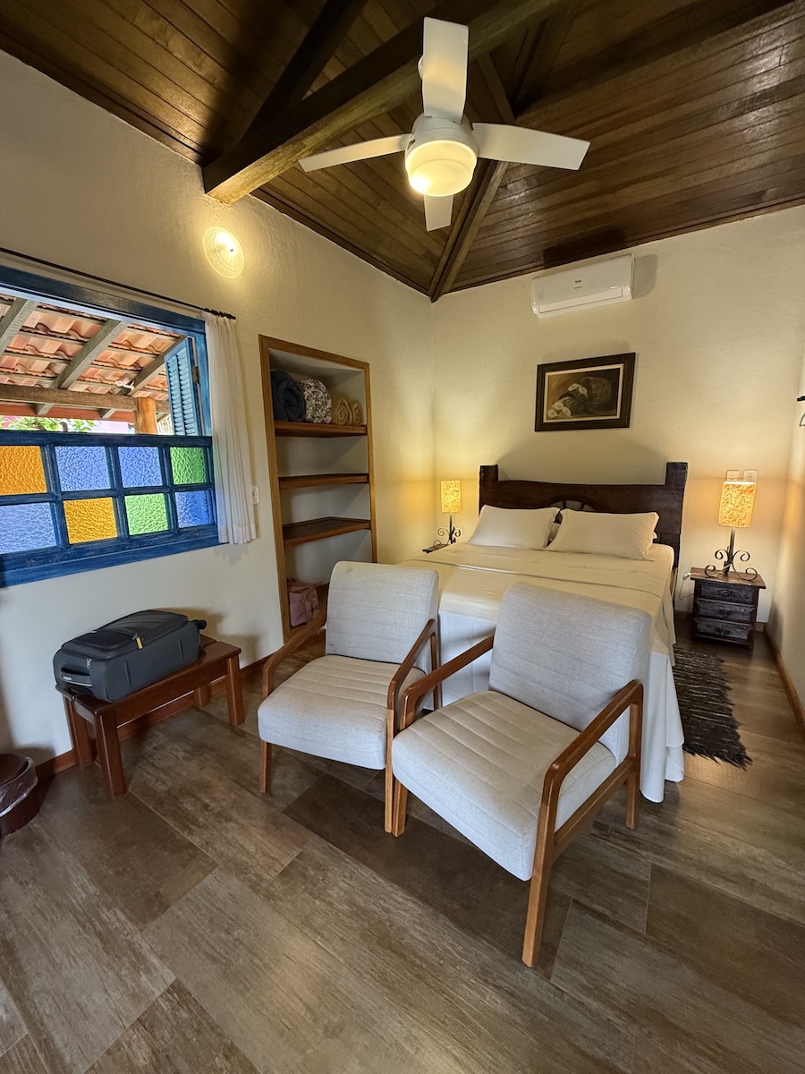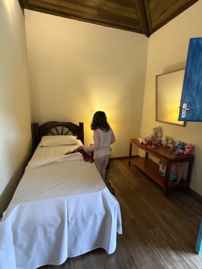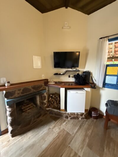 Ficamos hospedados na Pousada Cheiro da Terra, do Marivaldo, que recebe os hóspedes com muita atenção e cuidado. A pousada é impecável: limpa e com conforto. Os chalés são completos, com quarto para famílias, frigobar, tv, ar condicionado quente e frio, lareira, varanda com rede. Além disso, é bem localizada, logo na entrada da cidade, tem piscina, ateliê de cerâmica, café da manhã incluído na diária e a cachorrinha Jade, que foi sucesso na estadia.