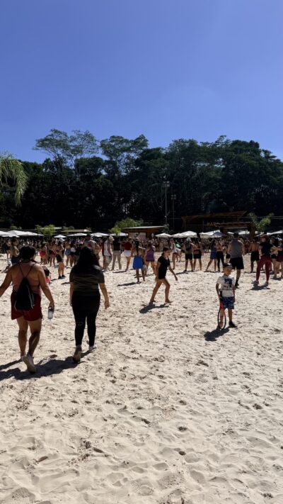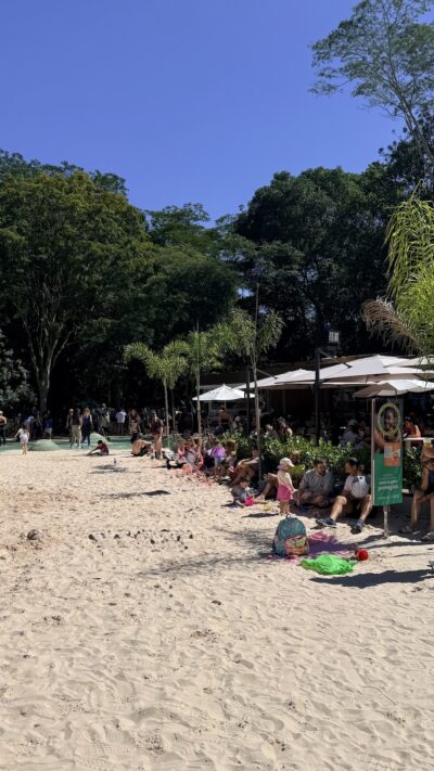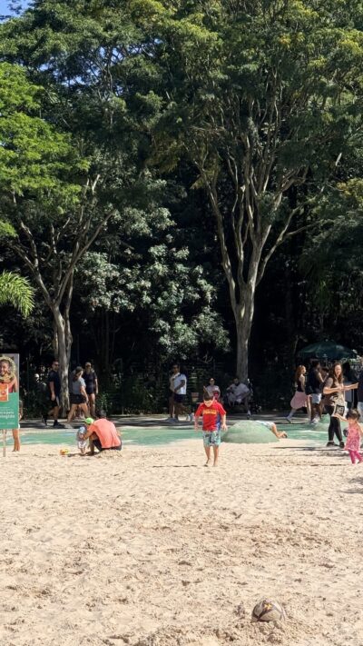 Entre as principais atrações estão quadras de areia (beach tennis e esportes de praia), aulões gratuitos ao longo do dia, areia para as crianças brincarem e recreação infantil, parque das águas (não estava funcionando quando fui), shows e música ao vivo e áreas de descanso e convivência.